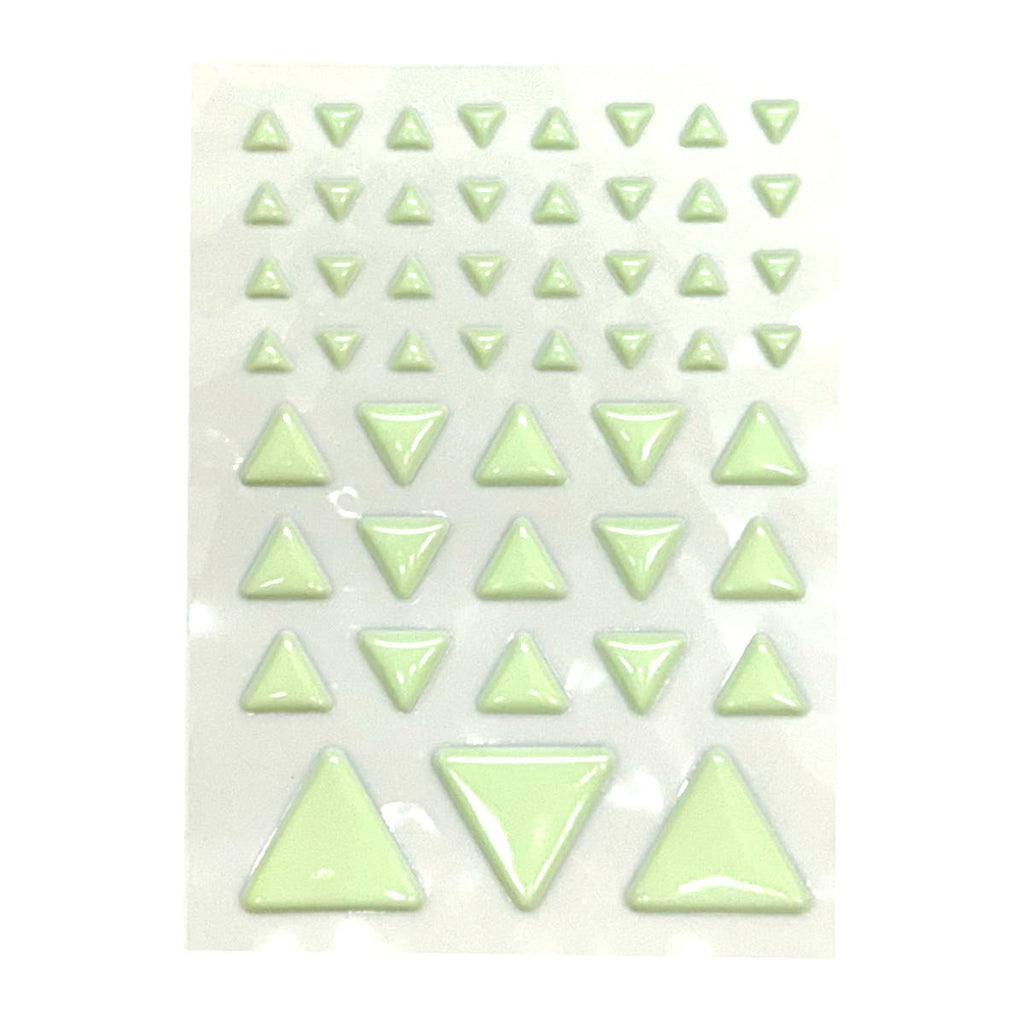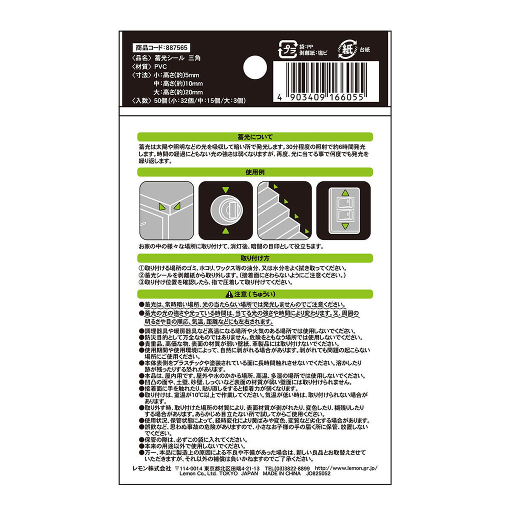 明るい所で光をためて暗闇で光る。 暗闇の目印としていろいろな場所の使えます。 三角ぷっくりタイプ。 入数:50個(小:32個/中:15個/大:3個)