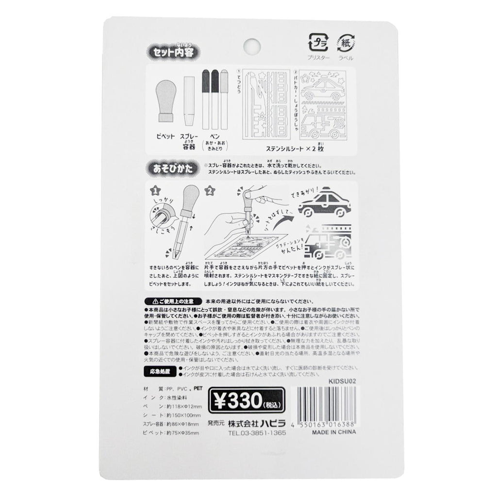 スプレーでおえかきするキットです。 ステンシルシート2枚入りで簡単に遊ぶことができます。