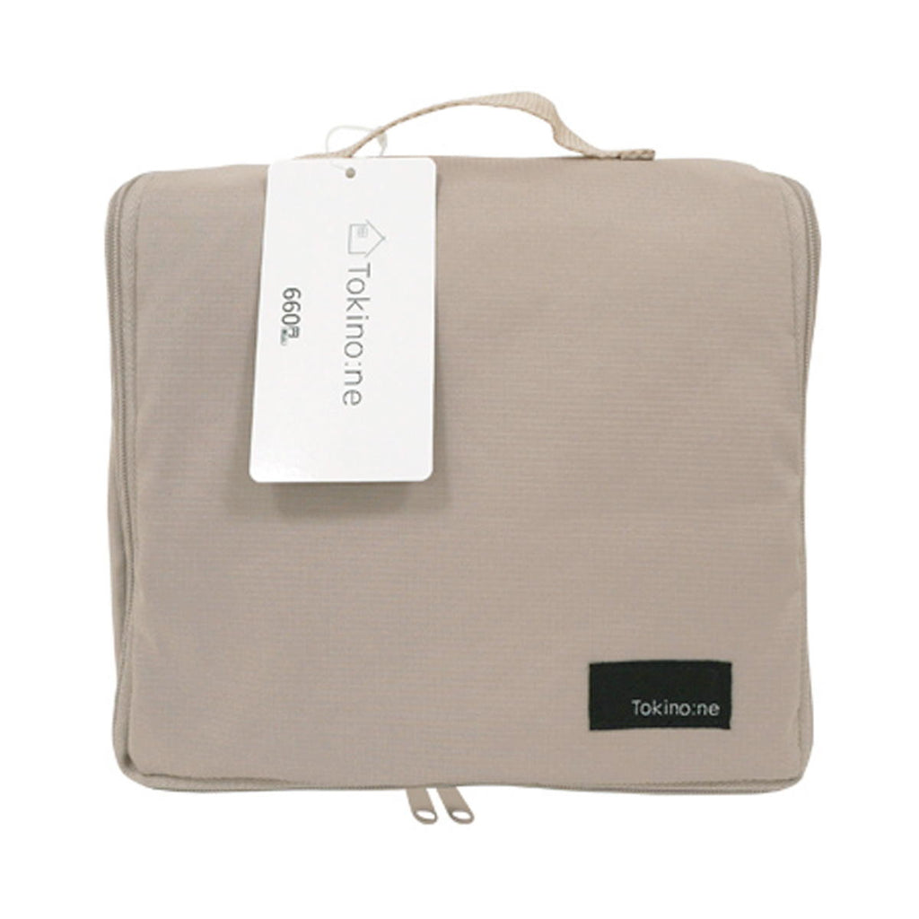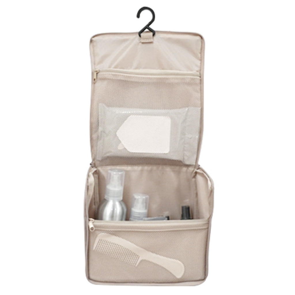 洗面用具等をフックで吊り下げて収納・使用できるベージュカラーのケースです。 ファスナー付メッシュポケットが2箇所あり、小物も分けられます。