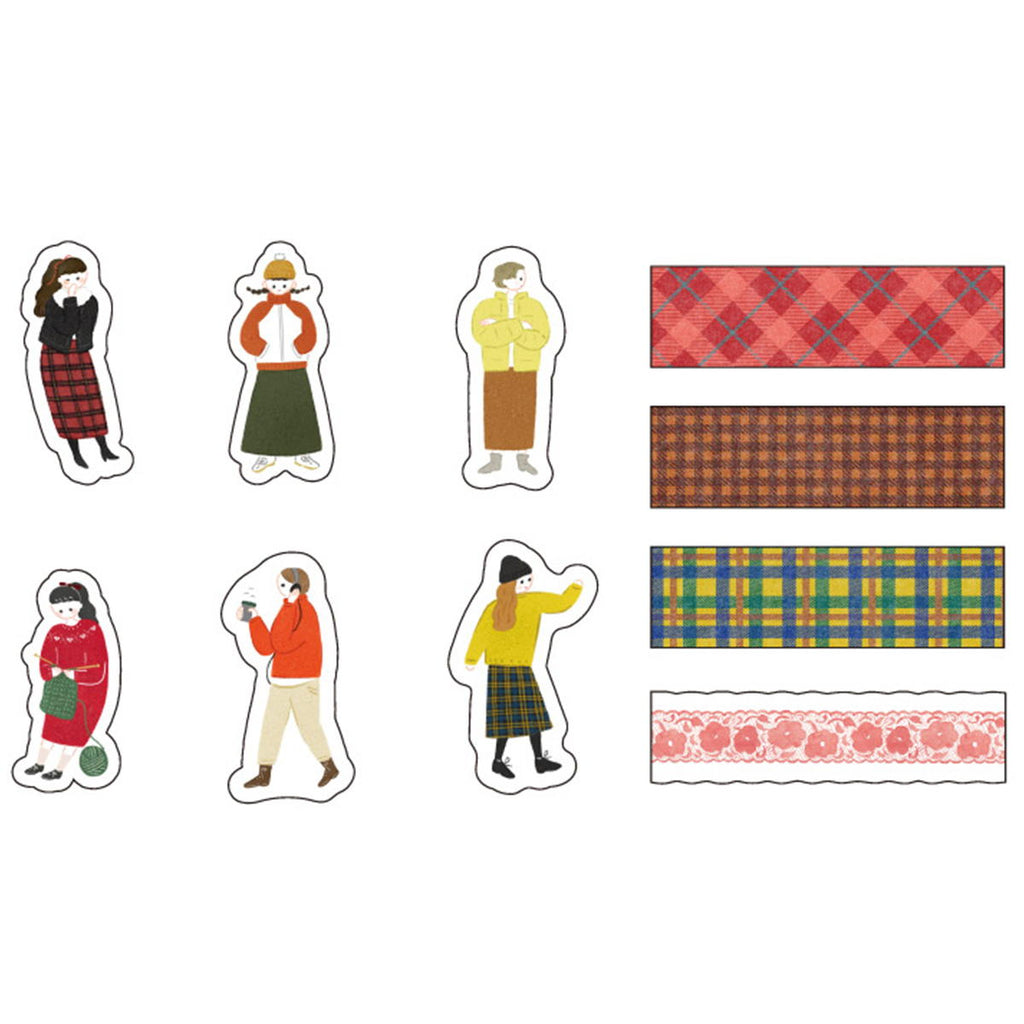 色別のかわいいあったかコーデの女の子と、コラージュにぴったりの柄が詰まったおしゃれなデザイン。