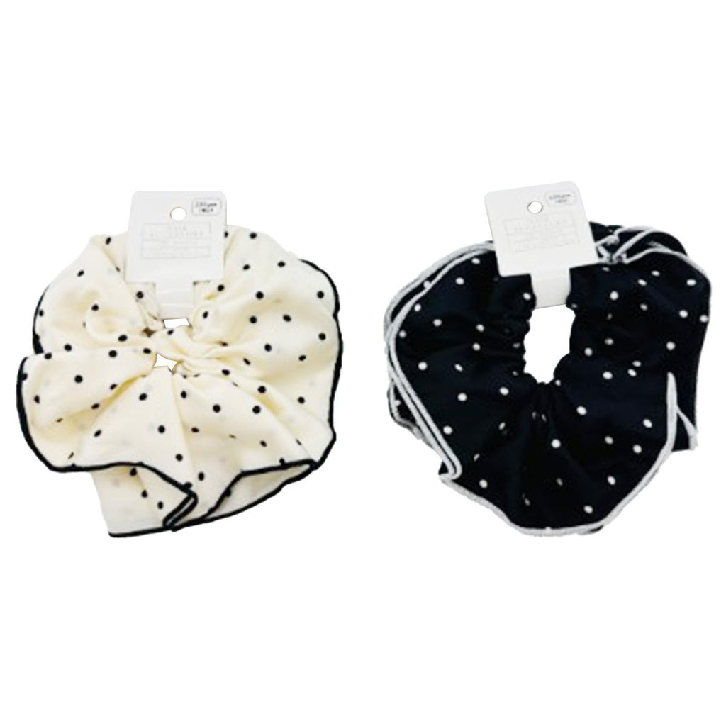 光沢のある生地にドット柄が可愛らしいシュシュです。 甘くなりすぎず、様々なコーディネートに合わせやすいアイテムです。