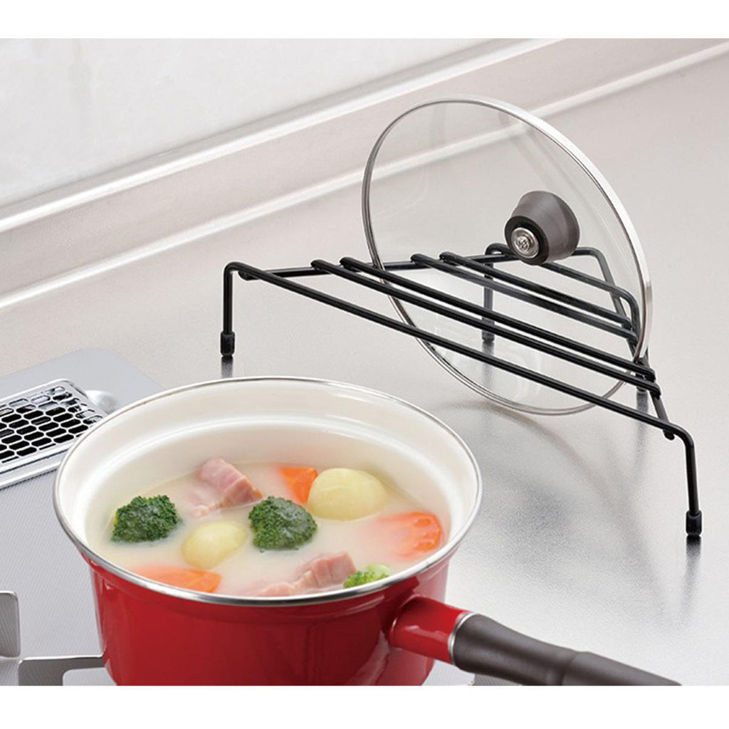 また、鍋蓋スタンドとしてもご利用いただける形状になっており、料理中の一時置きに便利なコーナーラックです。