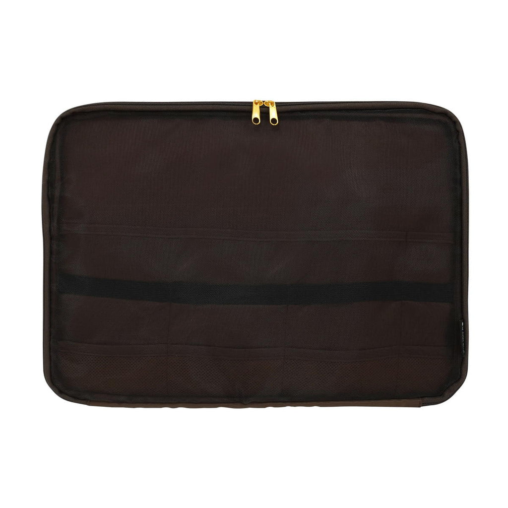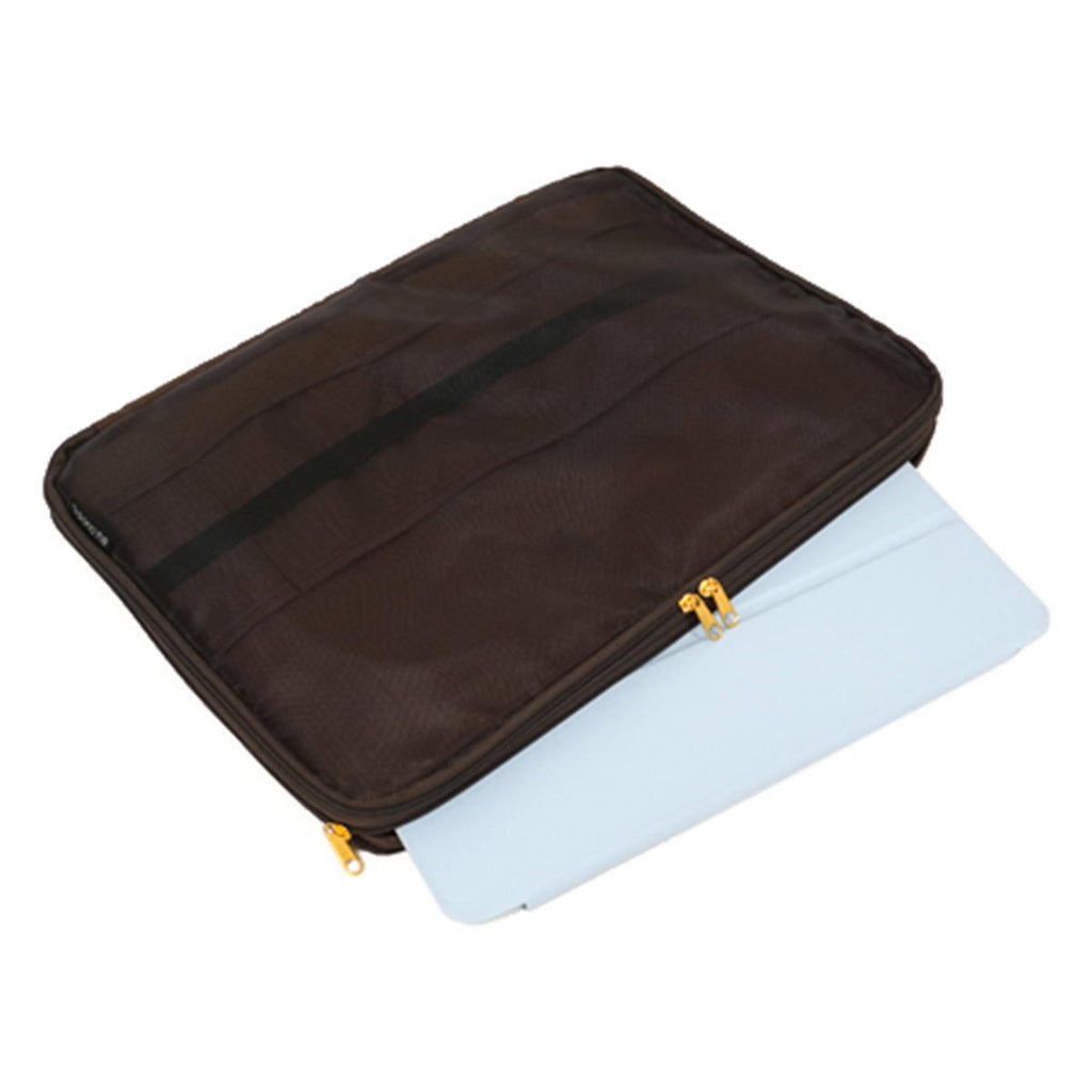 13インチまでのサイズを収納できるブラウン色のノートパソコンケースです。 外側の複数ポケットにコードなどを分けて収納することが出来ます。