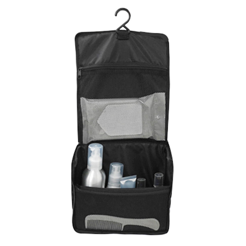洗面用具等をフックで吊り下げて収納・使用できるブラックカラーのケースです。 ファスナー付メッシュポケットが2箇所あり、小物も分けられます。