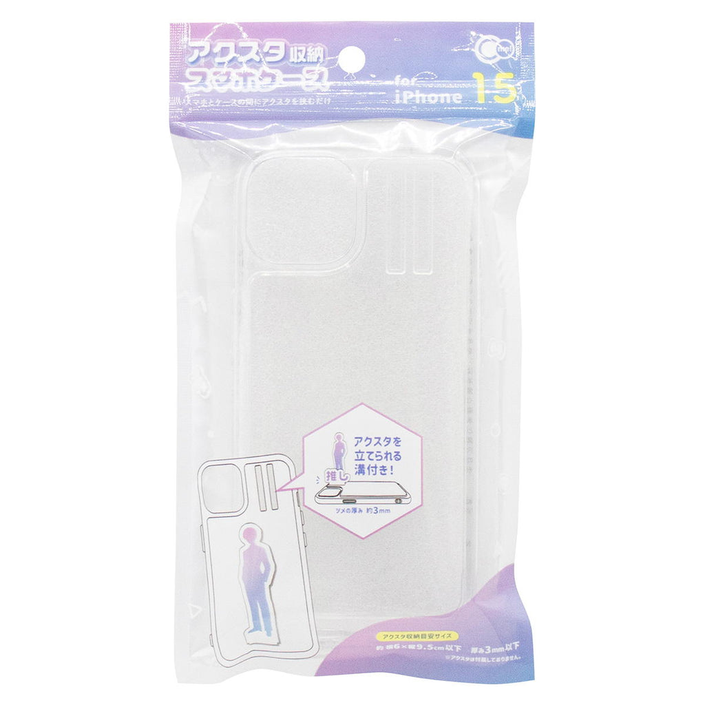スマホとケースの間にアクスタを挟んで持ち歩くことができます。 アクスタを立てられる溝付きです。 (ツメの厚み約3mm) 対応機種:iPhone15 アクスタ収納目安サイズ:6×9.5cm以下、厚み3mm以下
