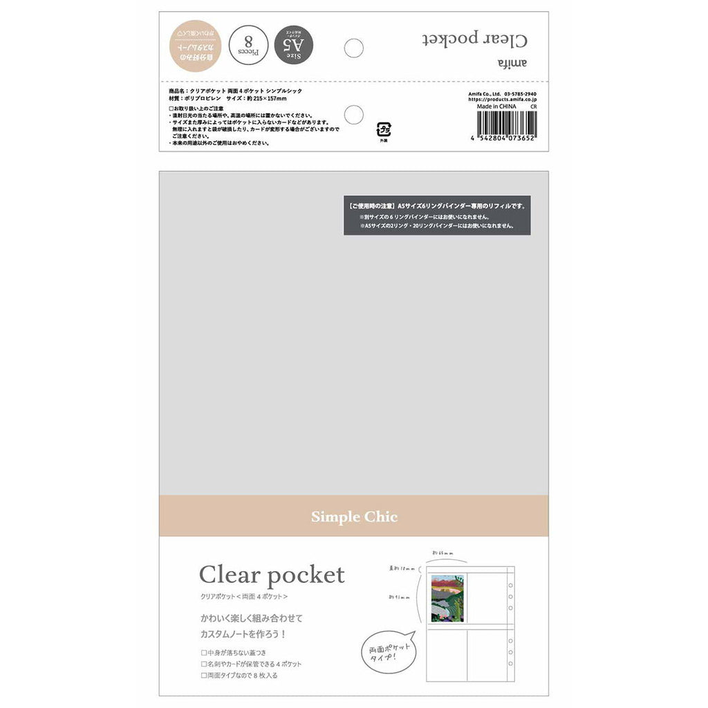名刺等が入るA5・6リングバインダー用クリアポケットです。 中身が落ちない蓋つきで、シンプルな4ポケット。 両面タイプなので8枚入ります。