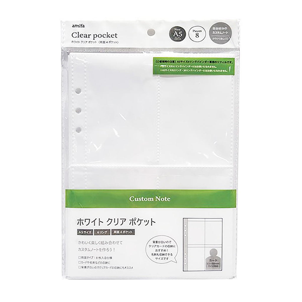 A5・6リングバインダー用クリアポケットです。 名刺やカードが保管できる両面4ポケットタイプです。 背景が白色タイプでクリアカードなどにも最適です。