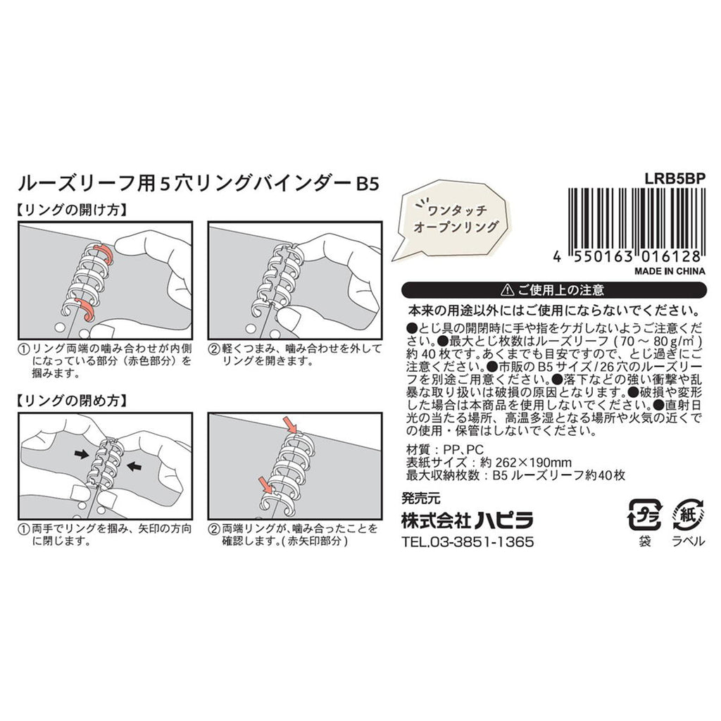 ルーズリーフ用の5穴リングバインダーです。 開きやすいクリアーの5穴リング2個と、ミルキーカラーのPP表紙2枚のセットです。