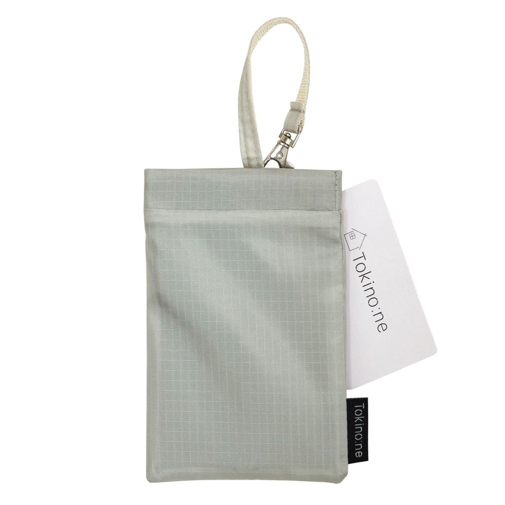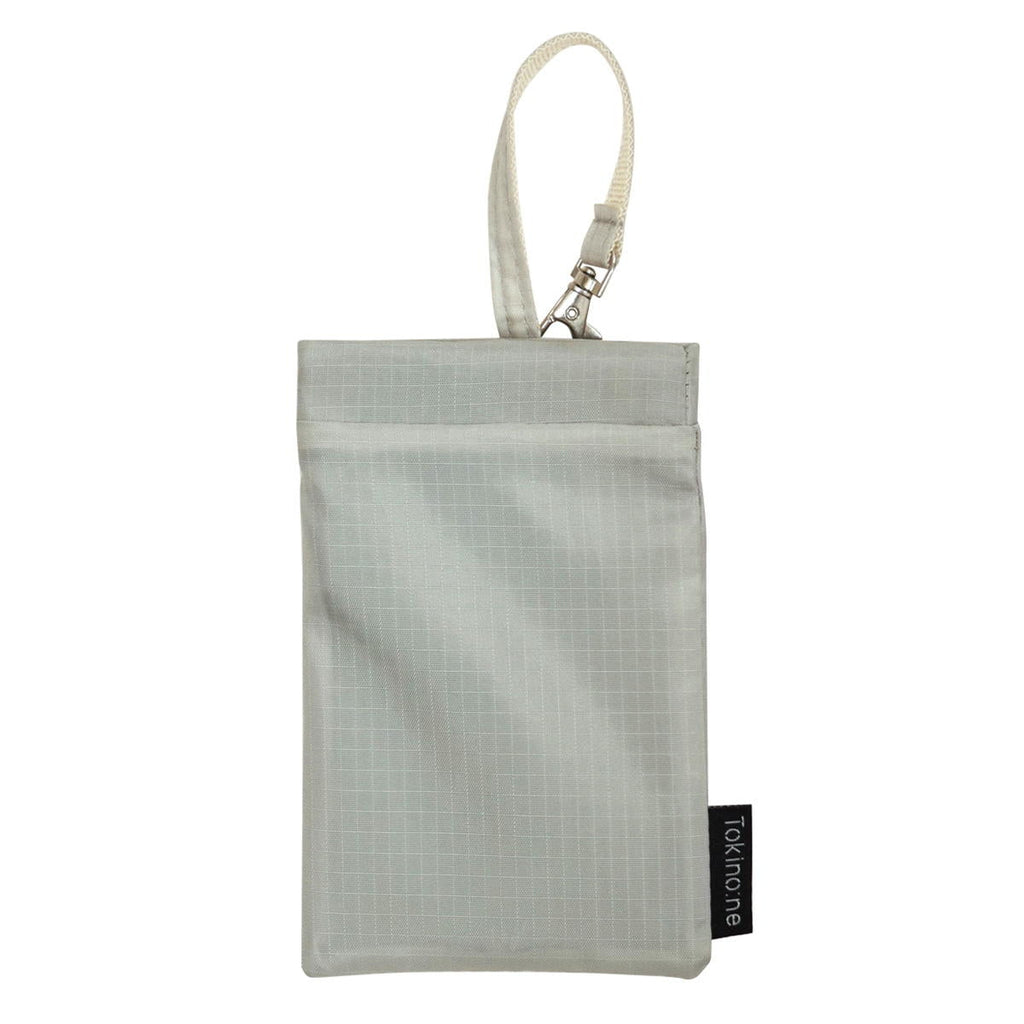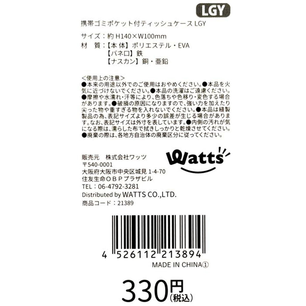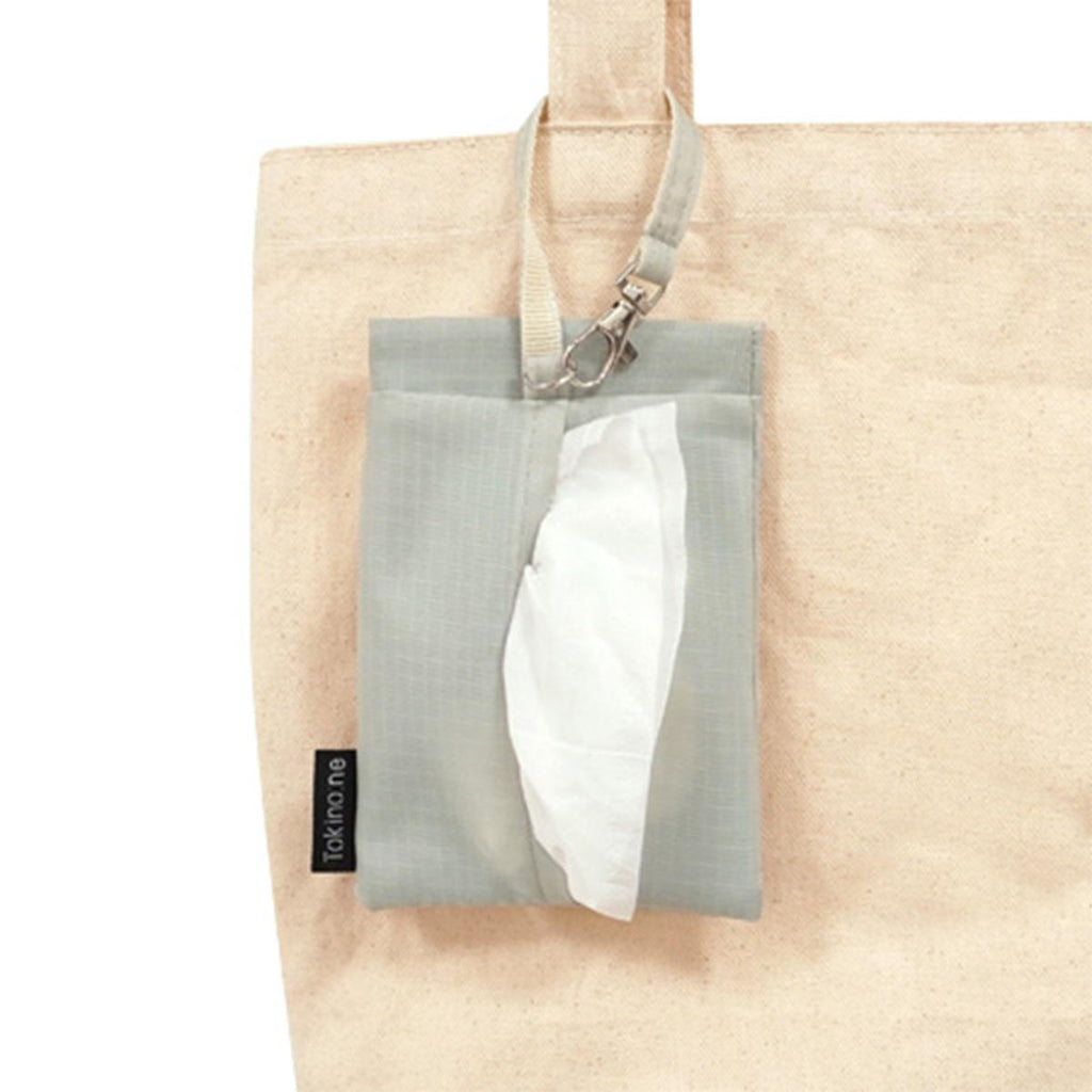 ライトグレーのゴミポケット付ポケットティッシュケースです。 バネ口で開閉がしやすいです。 内側はEVA素材で汚れをふき取れます。 ストラップでバッグなどに取り付けられます。