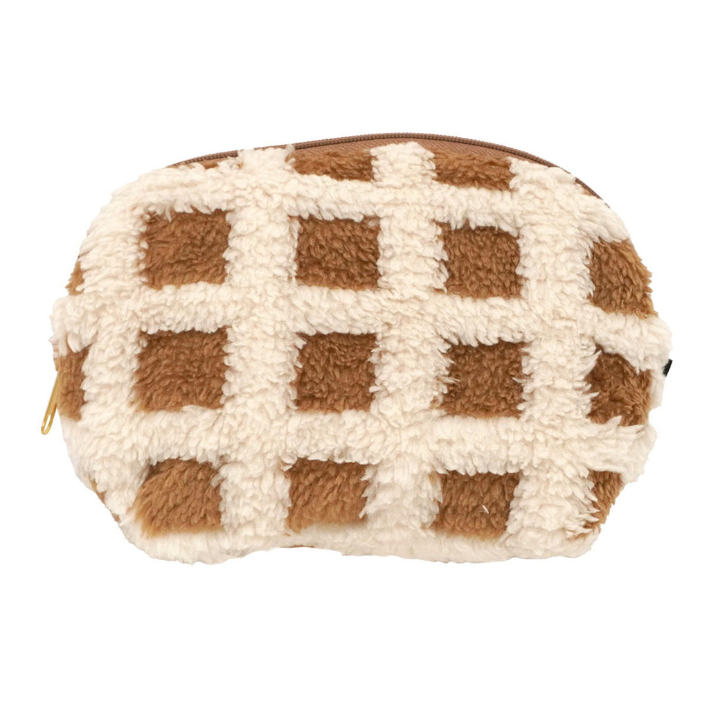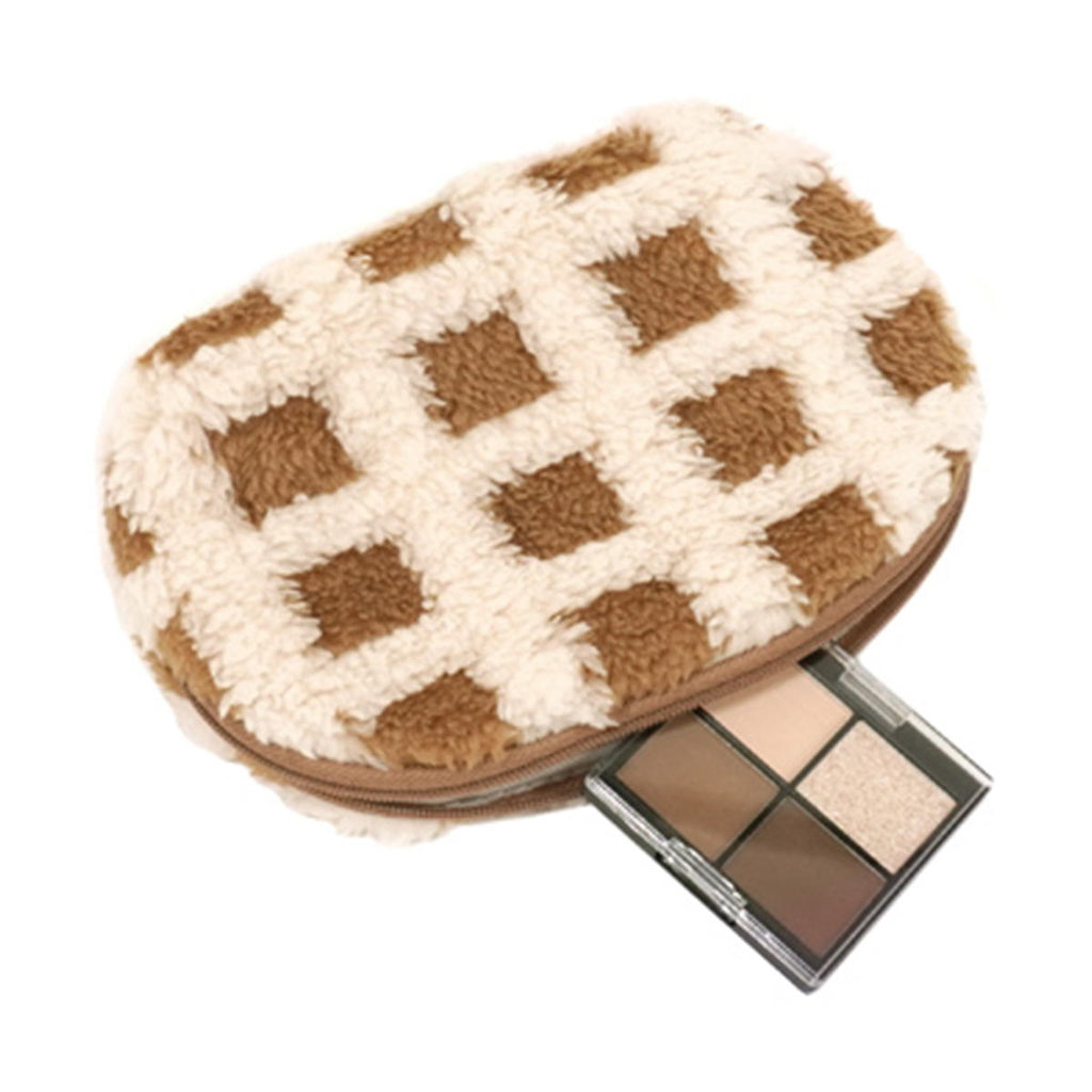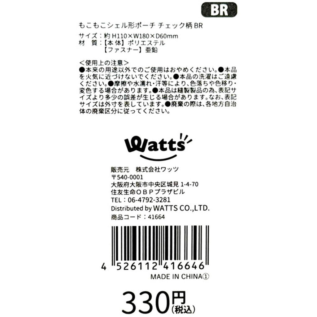 ブラウンとアイボリーのチェック柄起毛生地が可愛いシェル形ポーチです。 マチが大きく大容量で、コスメ類などの収納に便利です。