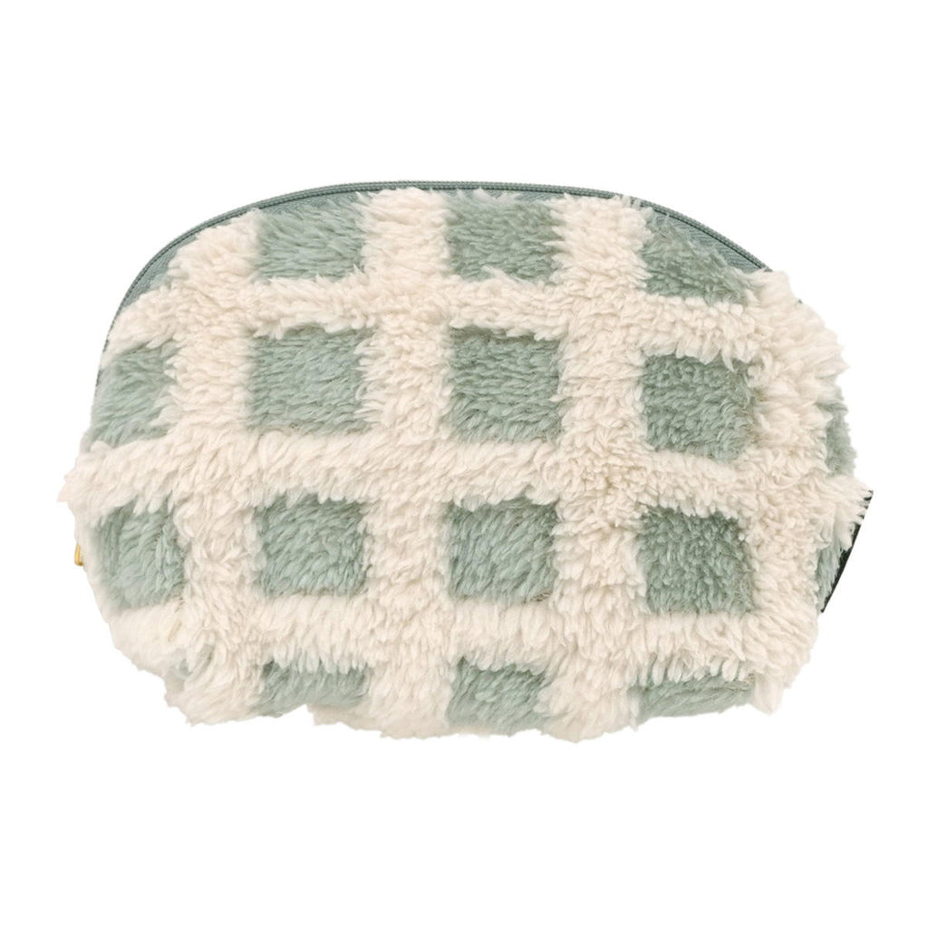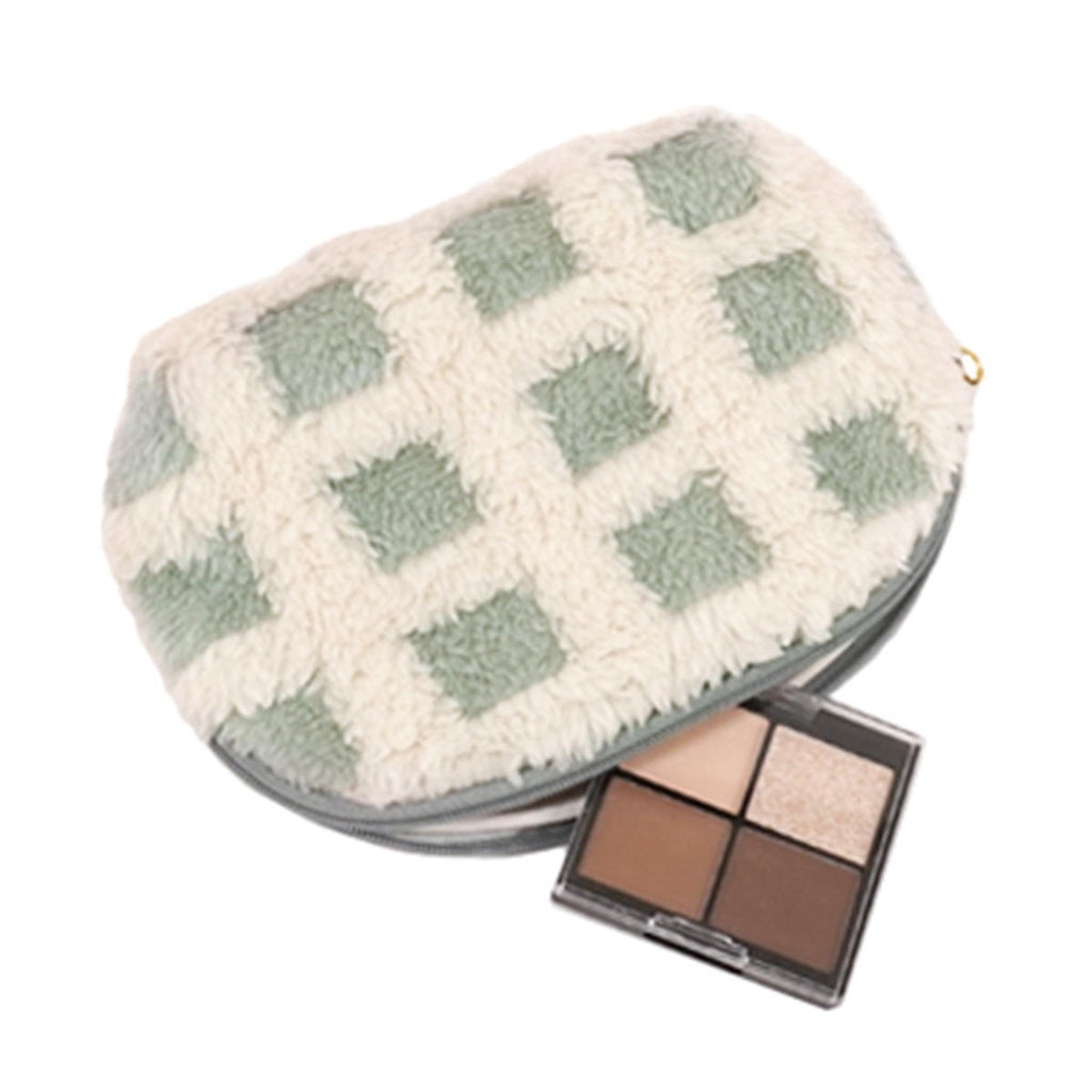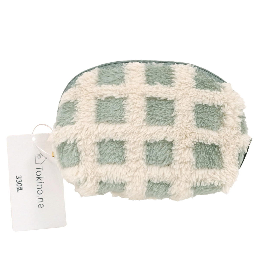 グレーとアイボリーのチェック柄起毛生地が可愛いシェル形ポーチです。 マチが大きく大容量で、コスメ類などの収納に便利です。