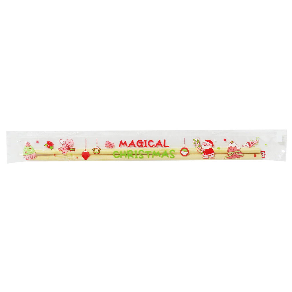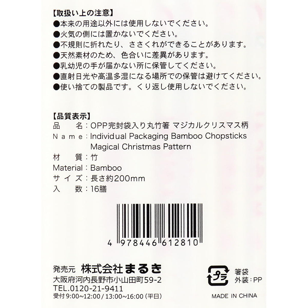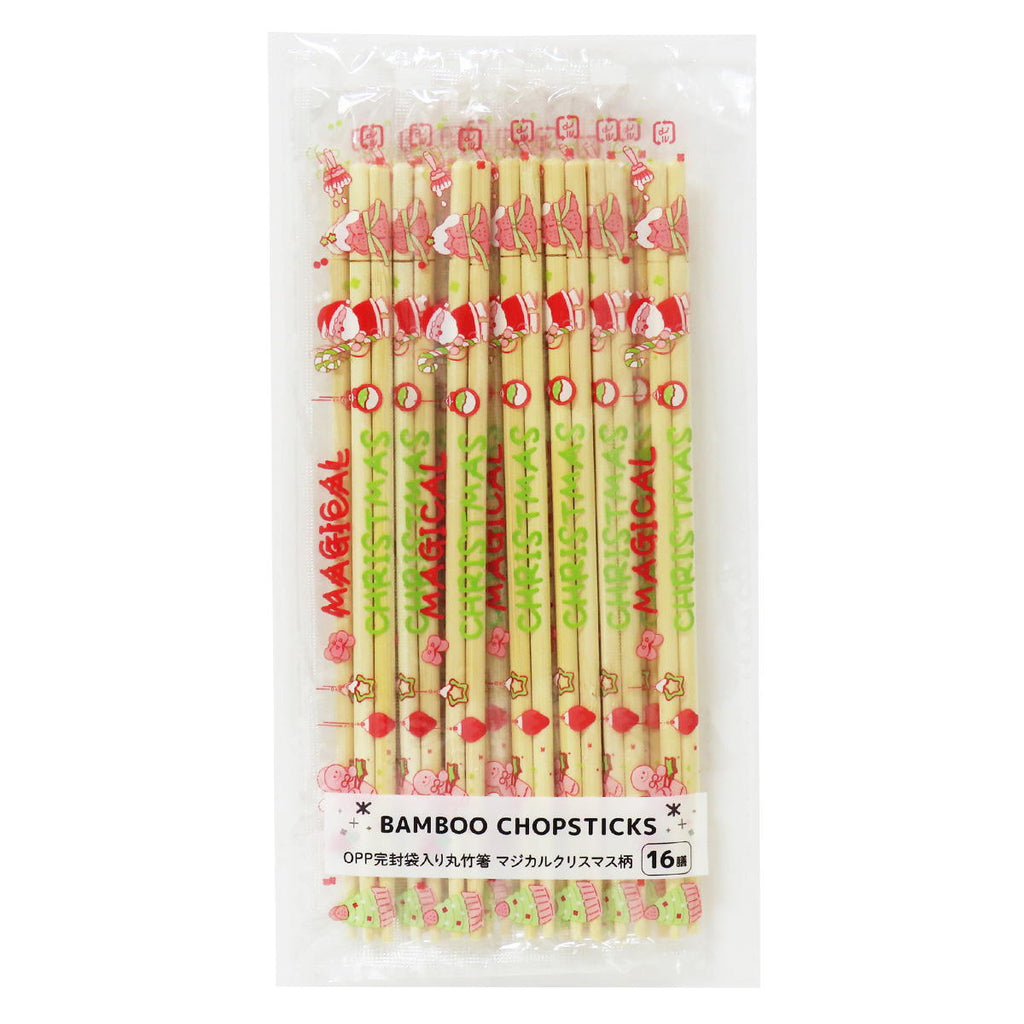 完封タイプの個包装袋入り丸竹箸、マジカルクリスマス柄。 約20cm、16膳入。 不規則に折れたり、ささくれができることがあります。 天然素材のため、色合いに差異があります。 入数:16膳