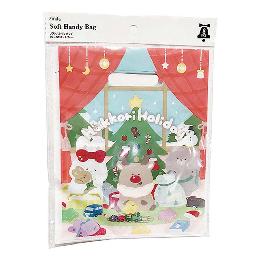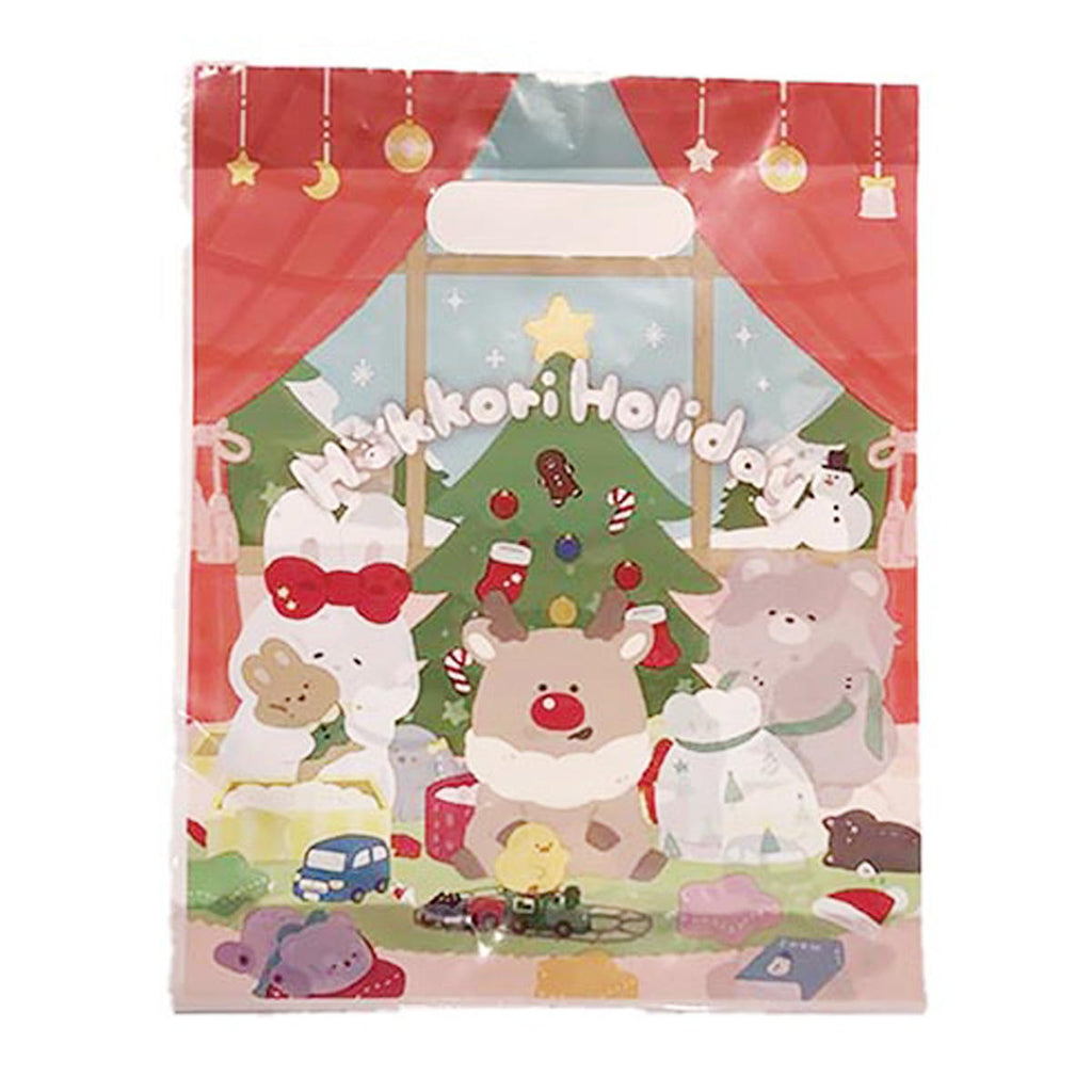 包装されたお菓子や雑貨がたっぷり入るハンディバッグです。 ソフト素材で破れにくく、中身が透けません。 ほっこりとホリデーを楽しむ動物達が描かれているかわいいデザインです。