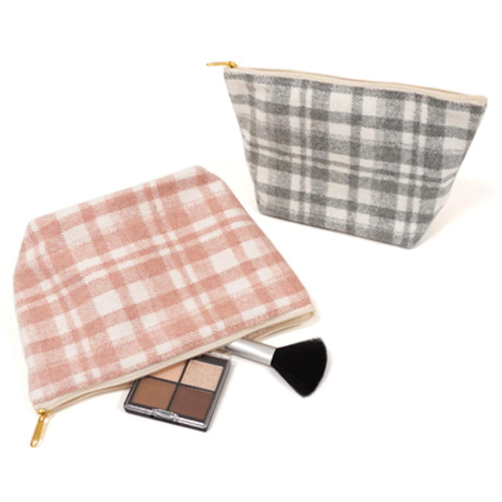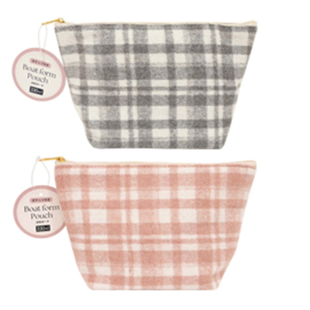 あたたかみのあるチェック柄生地と合皮の組み合わせが大人可愛い大き目サイズの舟形ポーチです。 中はオープンポケット付きで、整頓してものを収納できます。