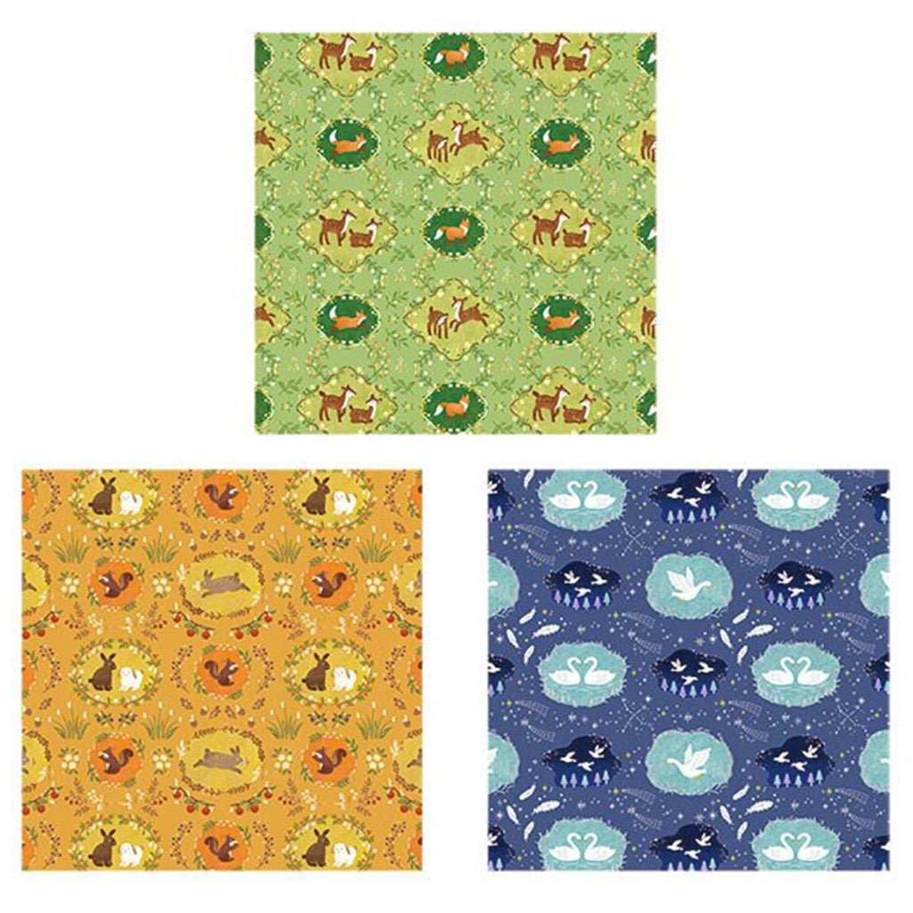 箔押しデザインペーパー3柄入り。 アイディア次第でラッピングやメモ、コラージュにも使えます。 動物たちが森や季節感のある風景におしゃれに溶け込んだデザインです。