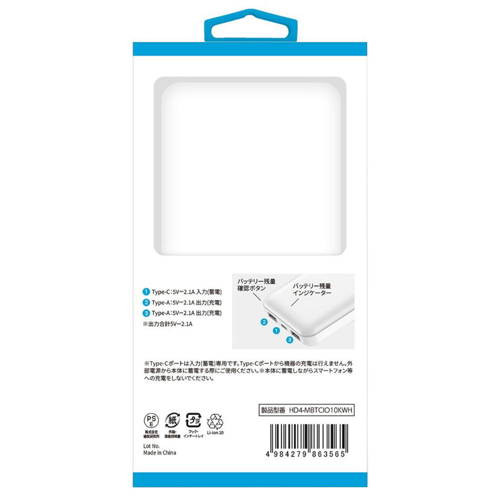 2台同時充電可能10000mAhモバイルバッテリー。 リチウムイオンポリマー、入力2.1A、合計出力2.1A、使用回数約500回、充電時間約6時間、Type-Cケーブル付属