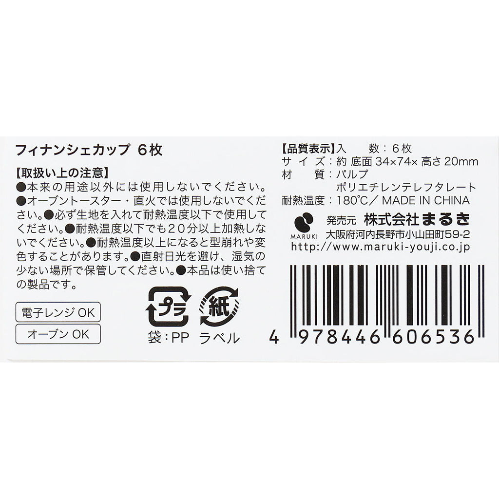 使い捨てのフィナンシェカップ。 電子レンジ・オーブン使用可、オーブントースター・直火使用不可。 耐熱温度以下でも20分以上加熱しないでください。 6枚入。 耐熱温度:180℃