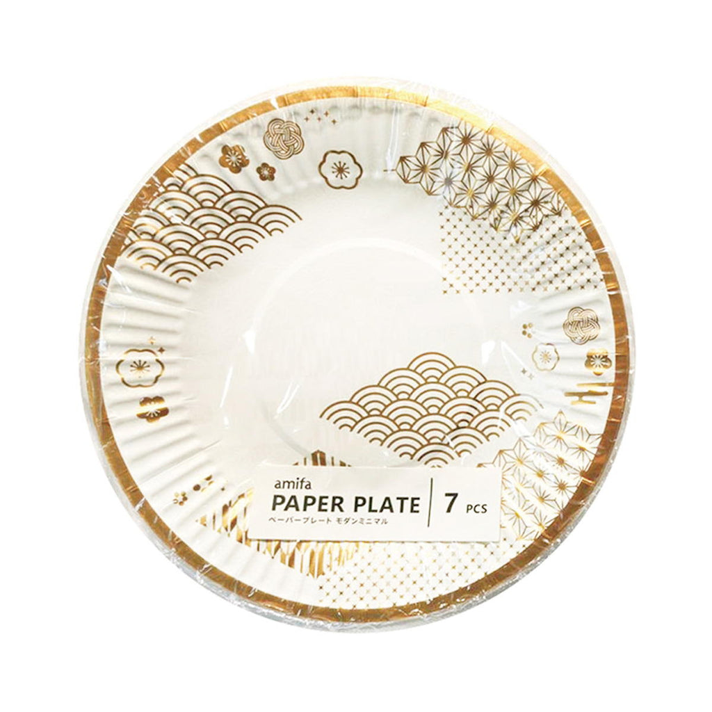ホームパーティーやレジャーで使える丸形のペーパープレートです。 シンプルな和柄に箔押しが豪華な高見え仕様です。