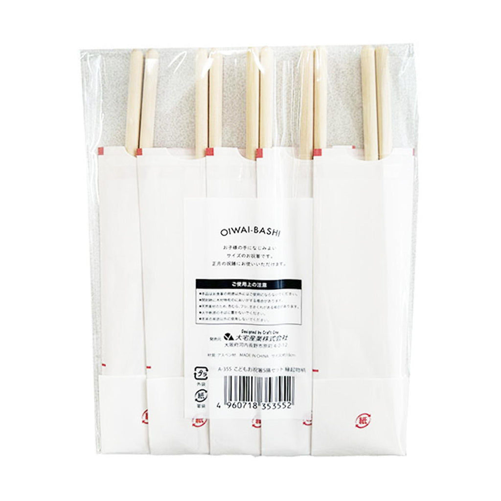 縁起物柄のデザインがはいった箸袋に18センチのこども用祝い箸を入れました。 18cm