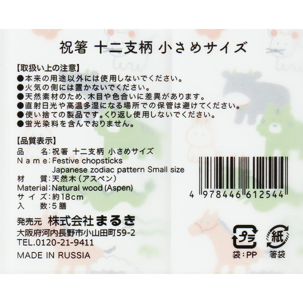 ・十二支柄の袴タイプの個包装袋入の祝箸、小さめサイズ。 ・5膳入。 ・天然素材のため、木目や色合いに差異があります。 ・本製品は使い捨ての製品です。 入数:5膳