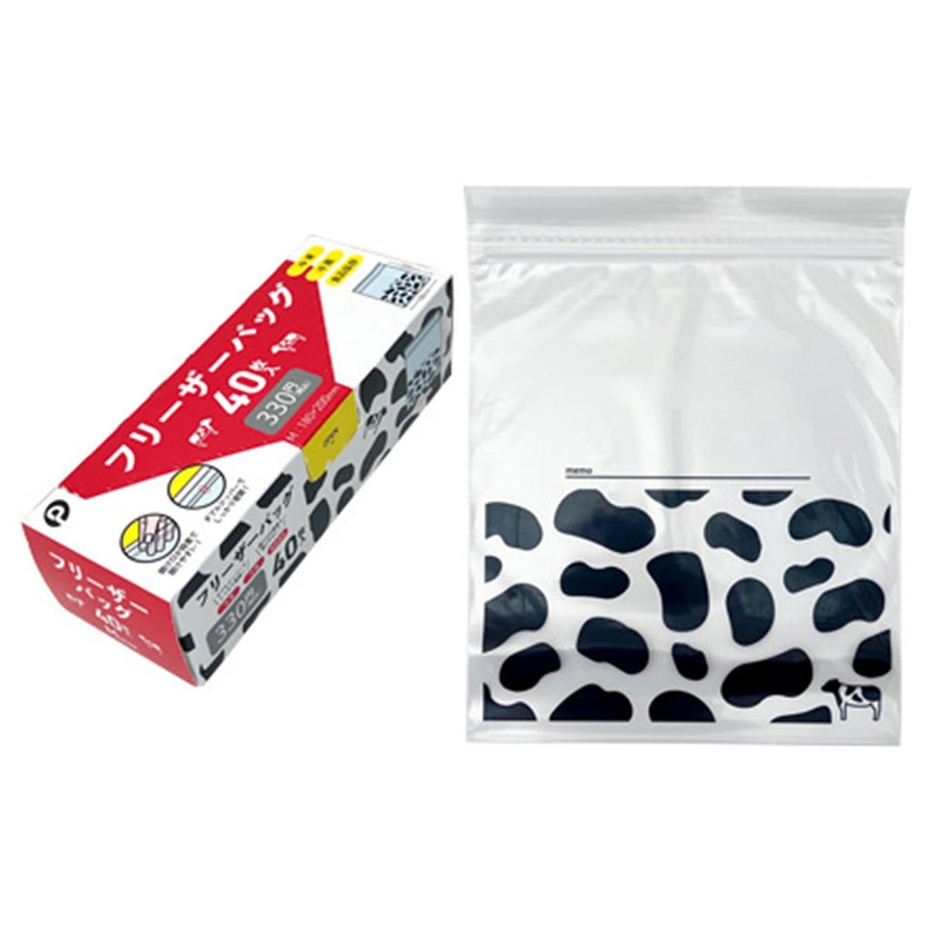 食品衛生適合品のフリーザーバッグです。 冷凍・冷蔵保存、本体牛柄。 耐冷温度-30℃、耐熱温度80℃