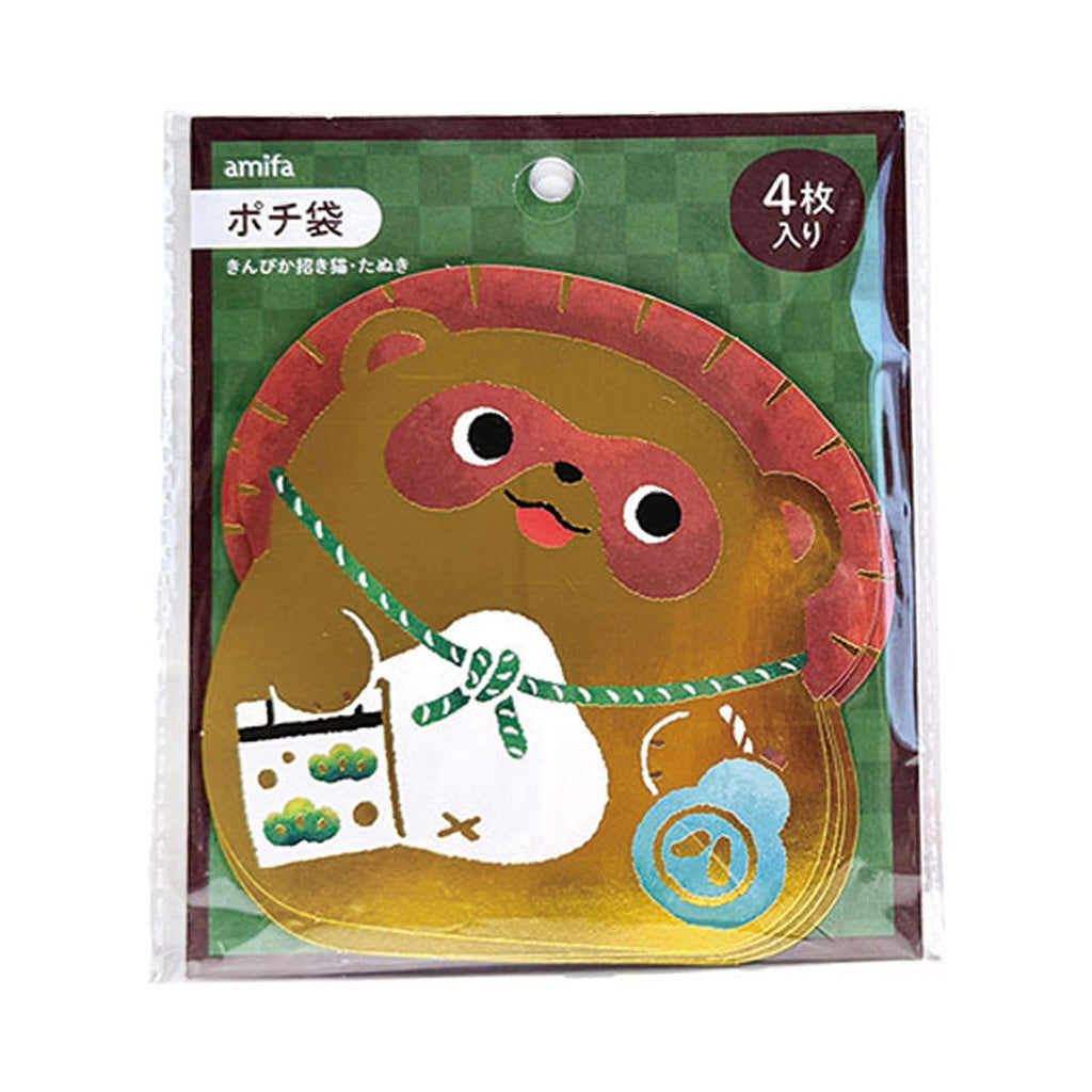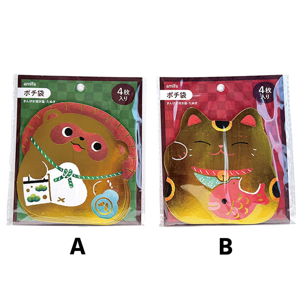 ダイカットのポチ袋です。 きんぴかで派手に楽しくお年玉などをいれてご使用できます。 きんぴかの招き猫とたぬきの2デザインです。