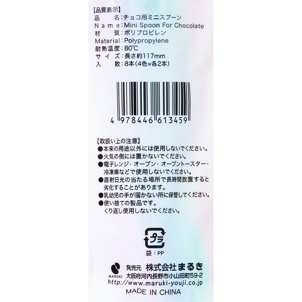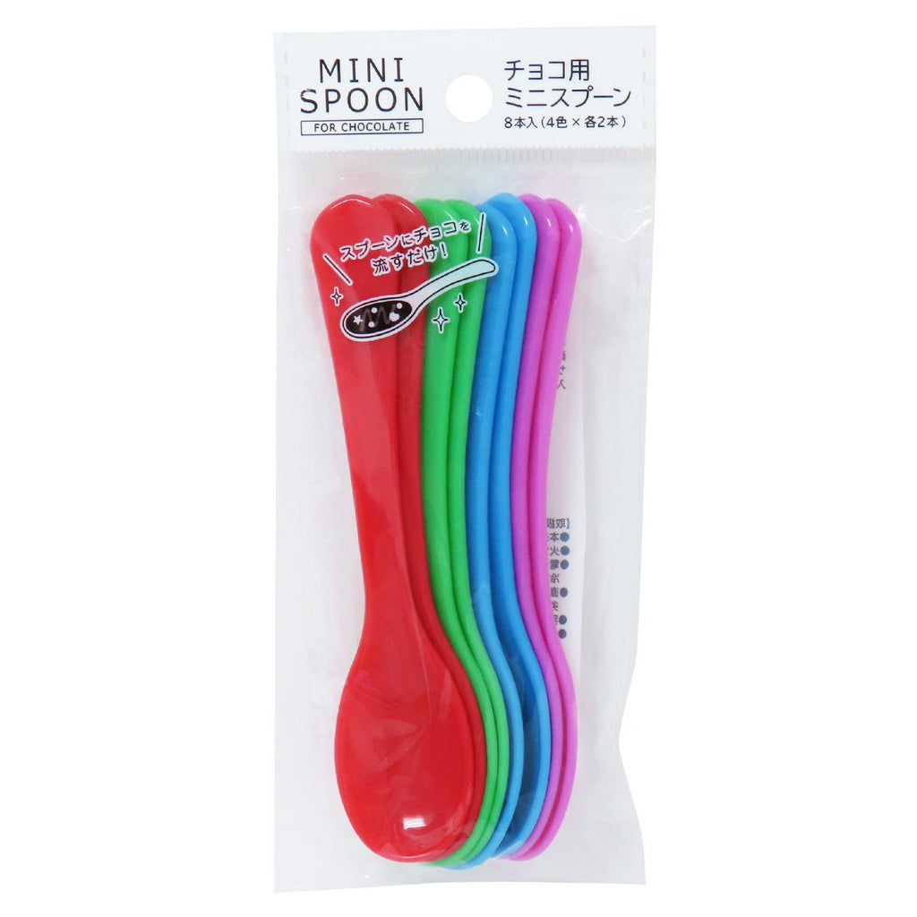 チョコレート用のミニスプーン。 4色×各2本、計8本入。 電子レンジ、オーブン、オーブントースター、冷凍庫など使用不可。 使い捨ての製品です。 耐熱温度:80℃