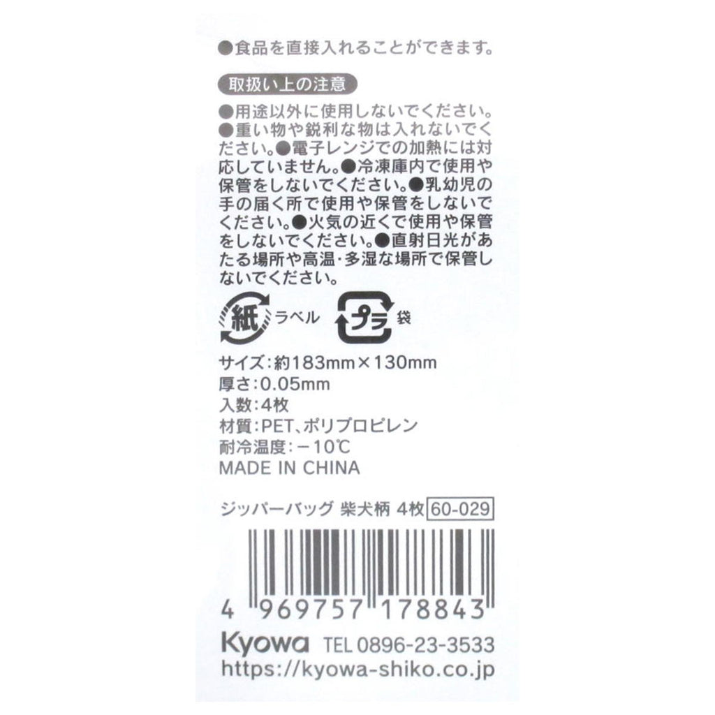 柴犬をデザインしたジッパーバッグです。 ラッピングやおすそ分けに最適です。 枚数:4枚。 厚さ0.05mm。 耐冷温度-10℃。