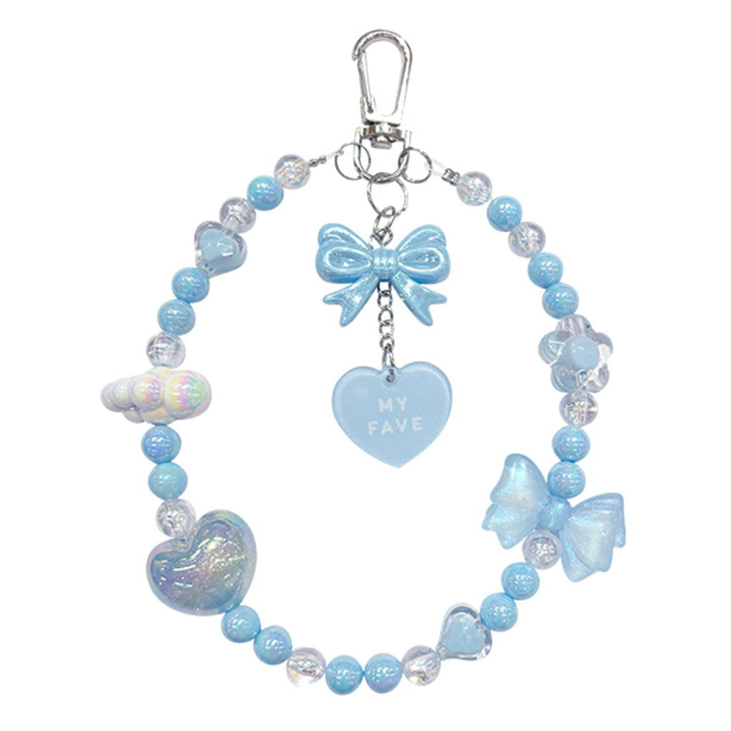ビーズキーホルダー、リボンチャーム、ハート型アクリルチャーム3点のキーホルダー。