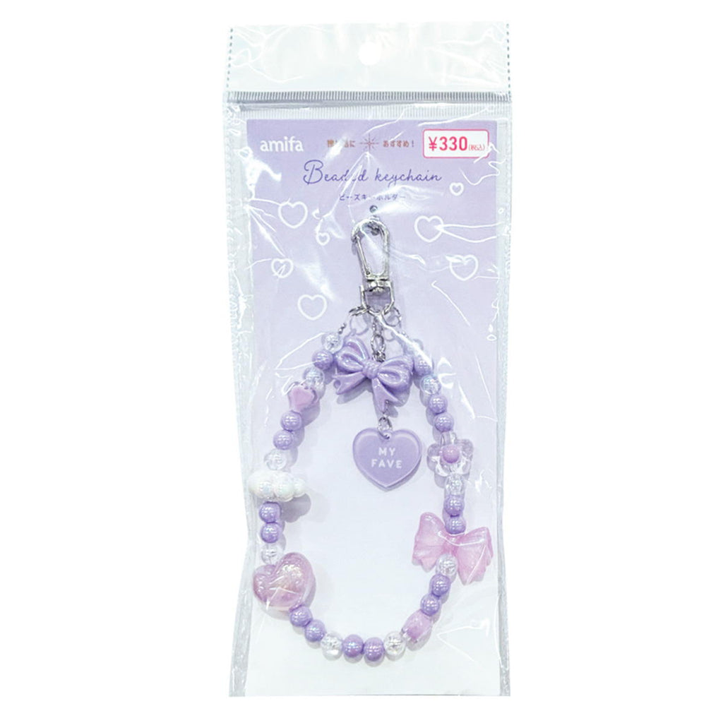 ビーズキーホルダー、リボンチャーム、ハート型アクリルチャーム3点のキーホルダー。 パープルでまとめたキーホルダー。