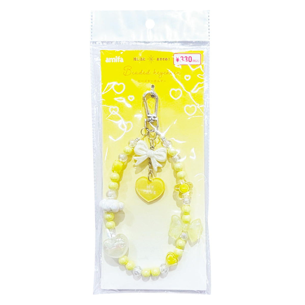 ビーズキーホルダー、リボンチャーム、ハート型アクリルチャーム3点のキーホルダー。 イエローでまとめたキーホルダー。