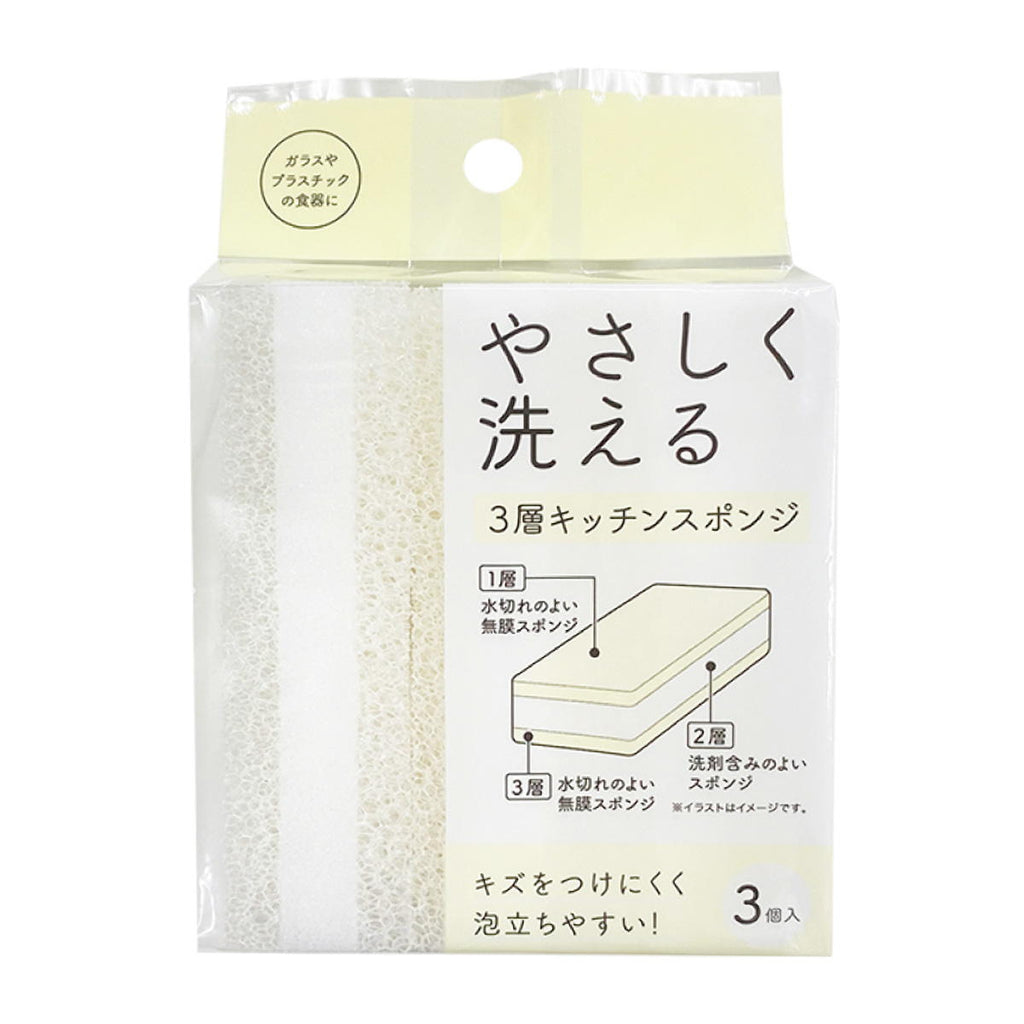 洗剤含みのよいスポンジが、水切れのよい無膜スポンジに挟まれた3層のキッチンスポンジです。 ガラスやプラスチックの食器をキズつけにくくやさしく洗えます。