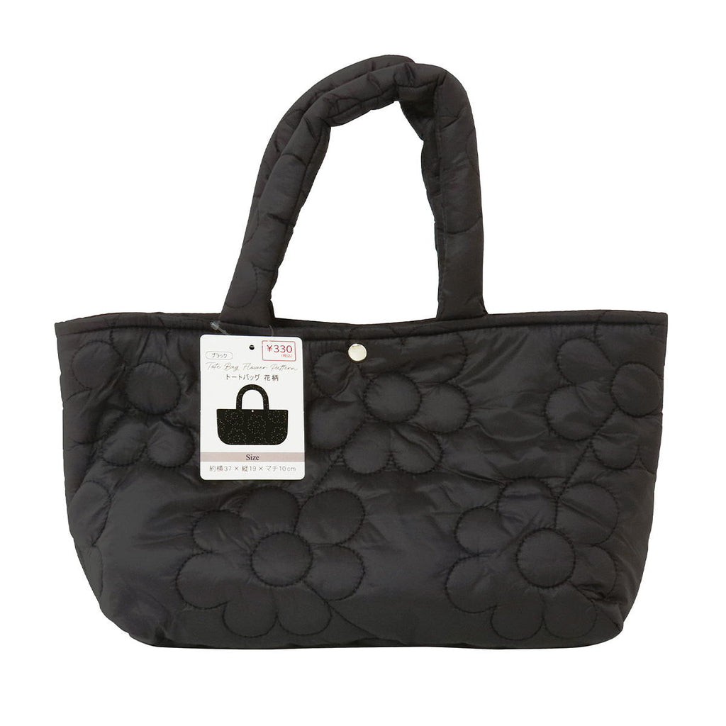 中綿入りのフワフワした素材の花柄トートバッグ、黒色。
