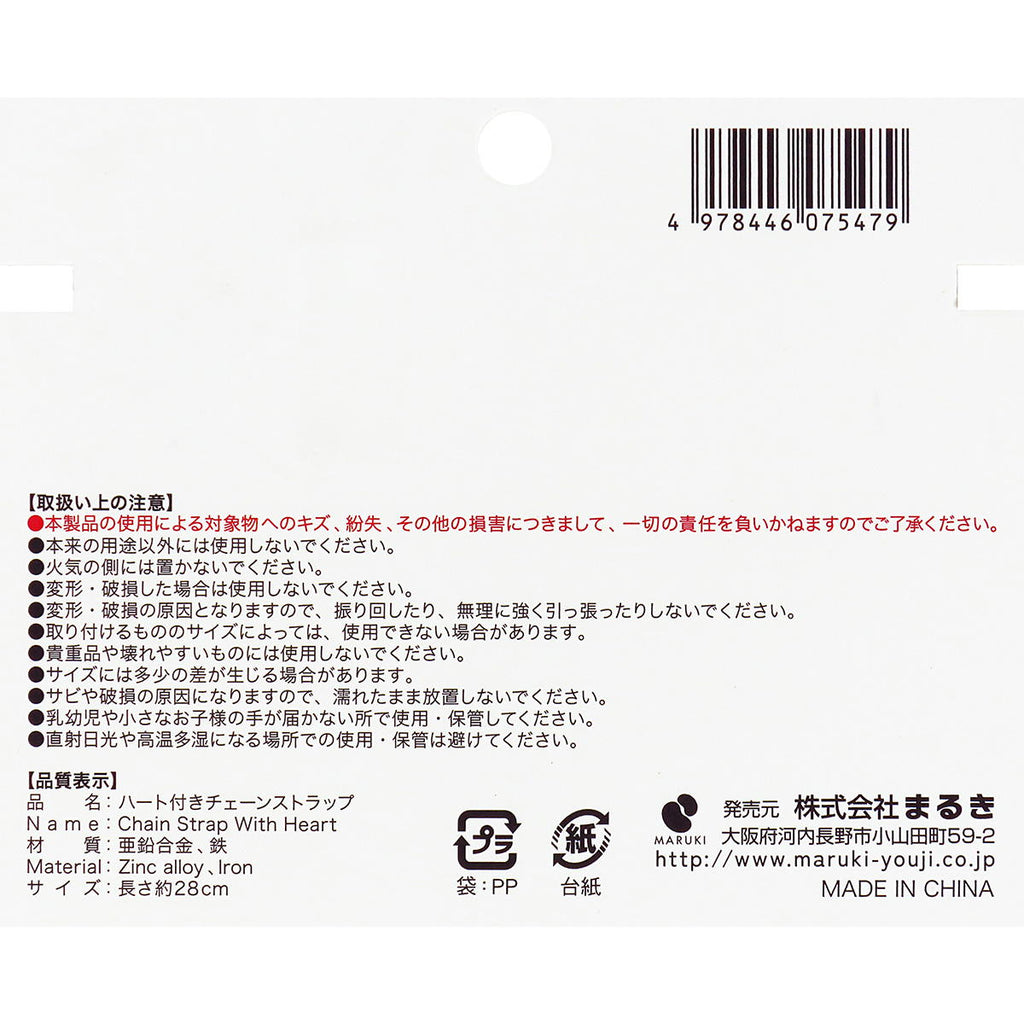 ハートのチャーム付きチェーンストラップ。