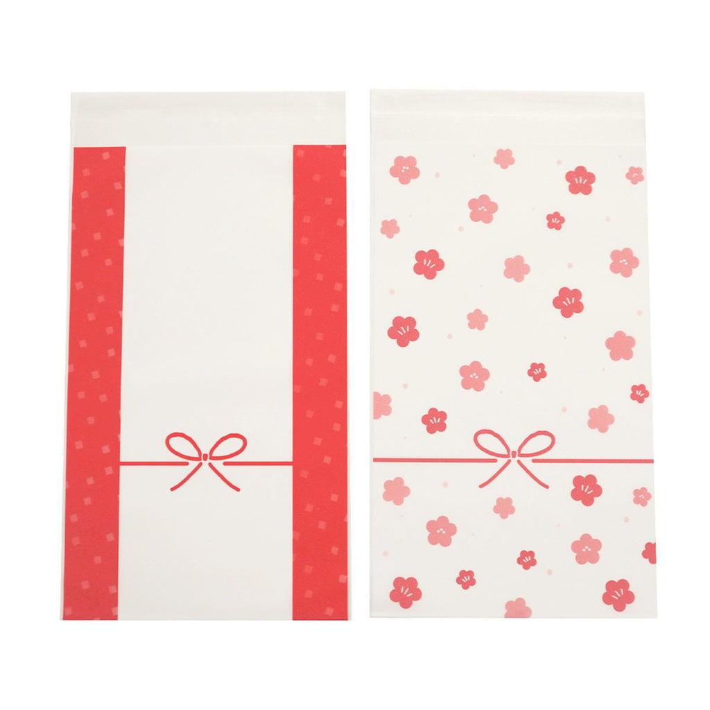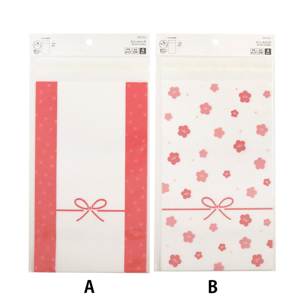 水引のイラストが描かれた、キラキラ印刷の糊付きビニールバッグです。 4枚入。 食品可。 耐冷温度:−20度