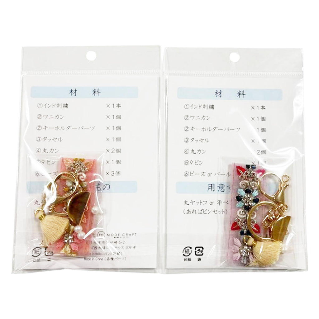 インド刺繍リボンでキーホルダーが作れるキットです。 完成品のサイズは約縦100mm横30mm高さ10mm