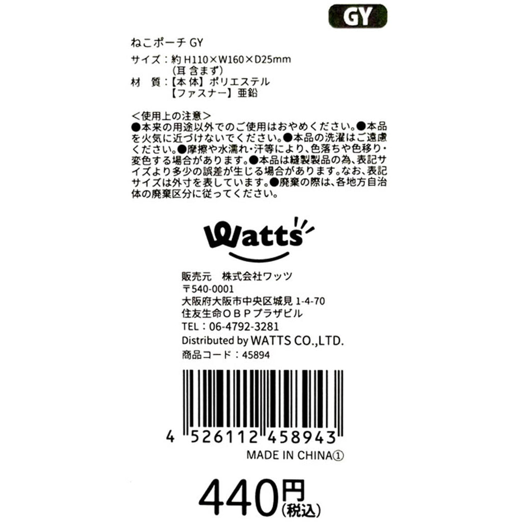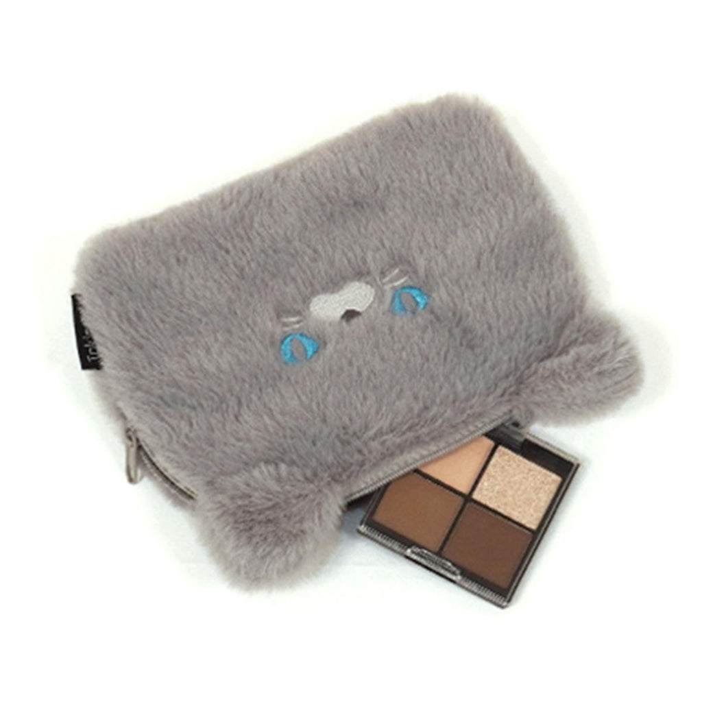 グレーのファー生地にネコの顔を刺繍した、耳付きのポーチです。 コスメ類が入るサイズです。