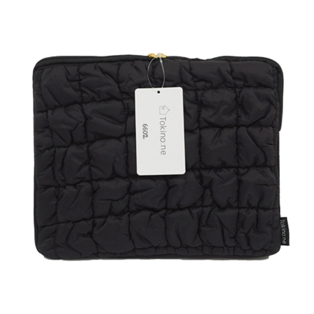 ブラックのふかふかキルティング生地にTokinone織ネーム付きのタブレットケースです。
